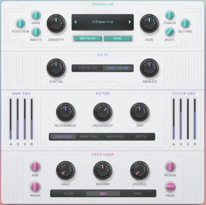 Rewindノブでコアとなるキャラクターを調整し、Half(1オクターブ下)とDouble(1オクターブ上)ノブで再生速度を変更できます。Age(摩耗)やWash(にじみ)でオーセンティックなアーティファクトを加え、Regenで発展的なフィードバックループを、Fadeでスムーズなトランジションを作り出します。