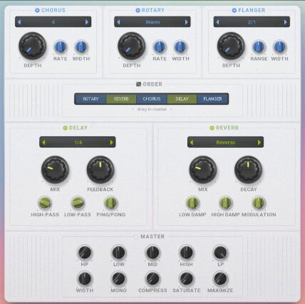 中央のOrderパネルで自由にエフェクトの順序を変更できるため、独自のサウンドデザインが可能です。Masterセクションでは、3バンドEQ、HPF/LPF、Width/Mono、Compressor、Saturate、Maximizeで最終的なサウンドを磨き上げ、ミックスレディな状態に仕上げます。